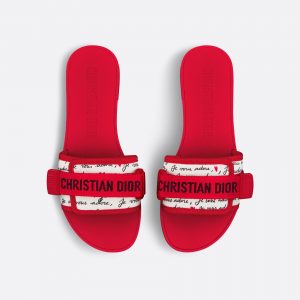 Part of the Dioramour capsule, the Dio(r)evolution slide is a summer wardrobe staple. The Christian Dior signature self-fastening strap adorns the white technical fabric upper, which showcases the black and red Je Vous Adore (I Love You) motif, inspired by the Marc Bohan for Dior archives.